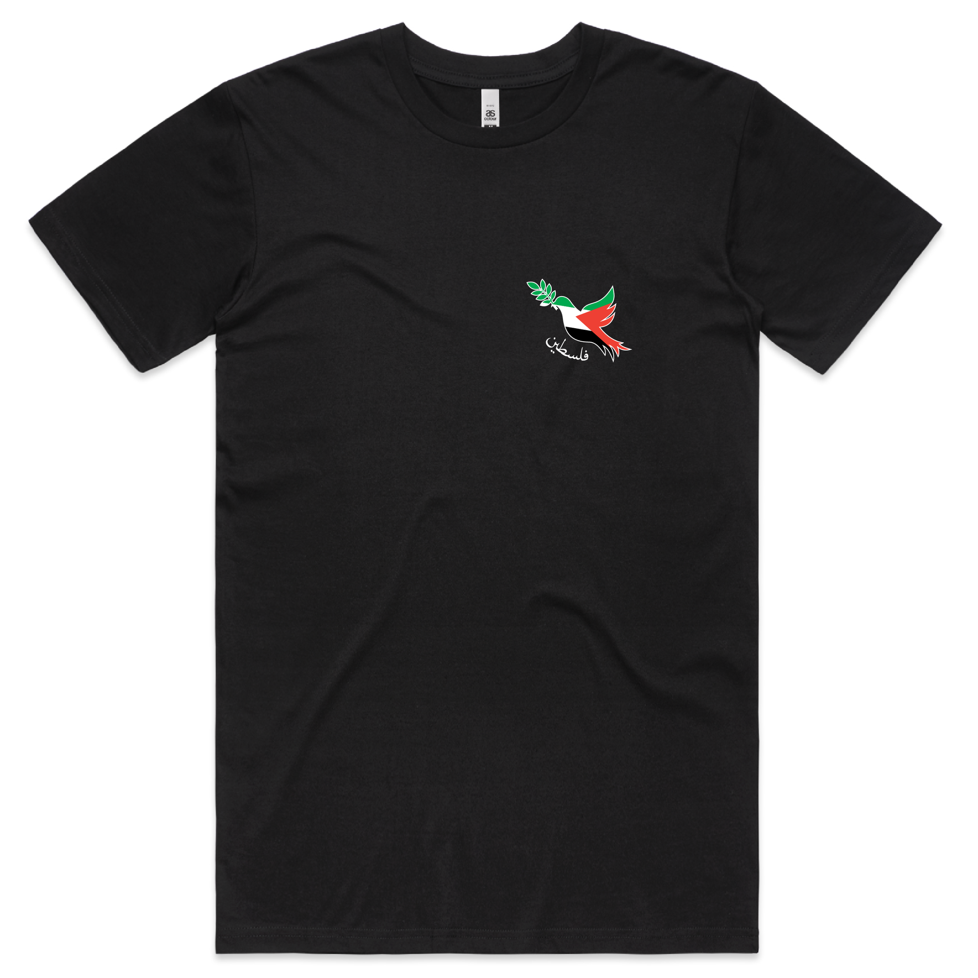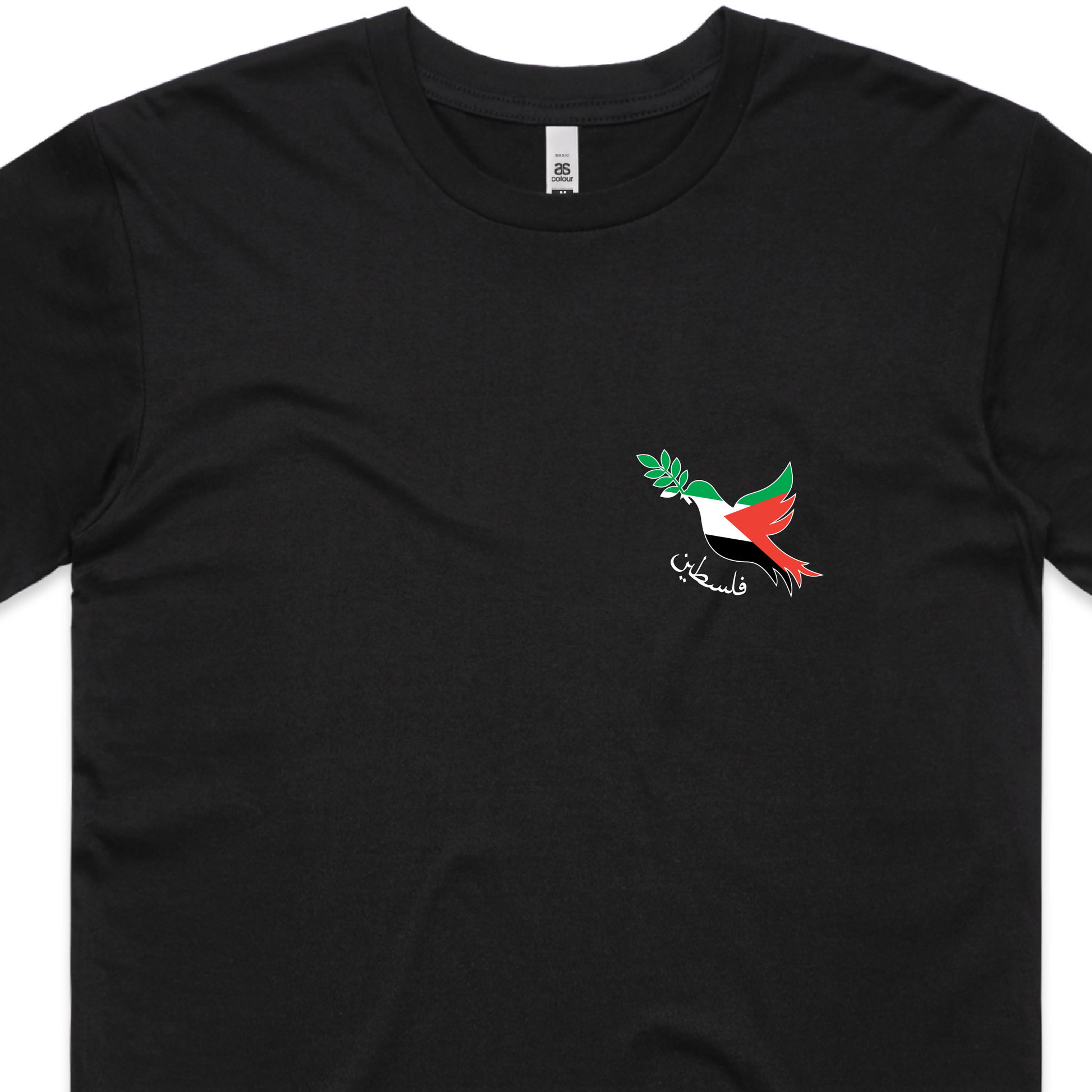 The dove is a symbol of peace. Represented in the colours of the Palestinian flag (upside down to symbolise that country has been turned upside down) with Palestine written in Arabic below, hopefully one day soon there will be peace in the region.