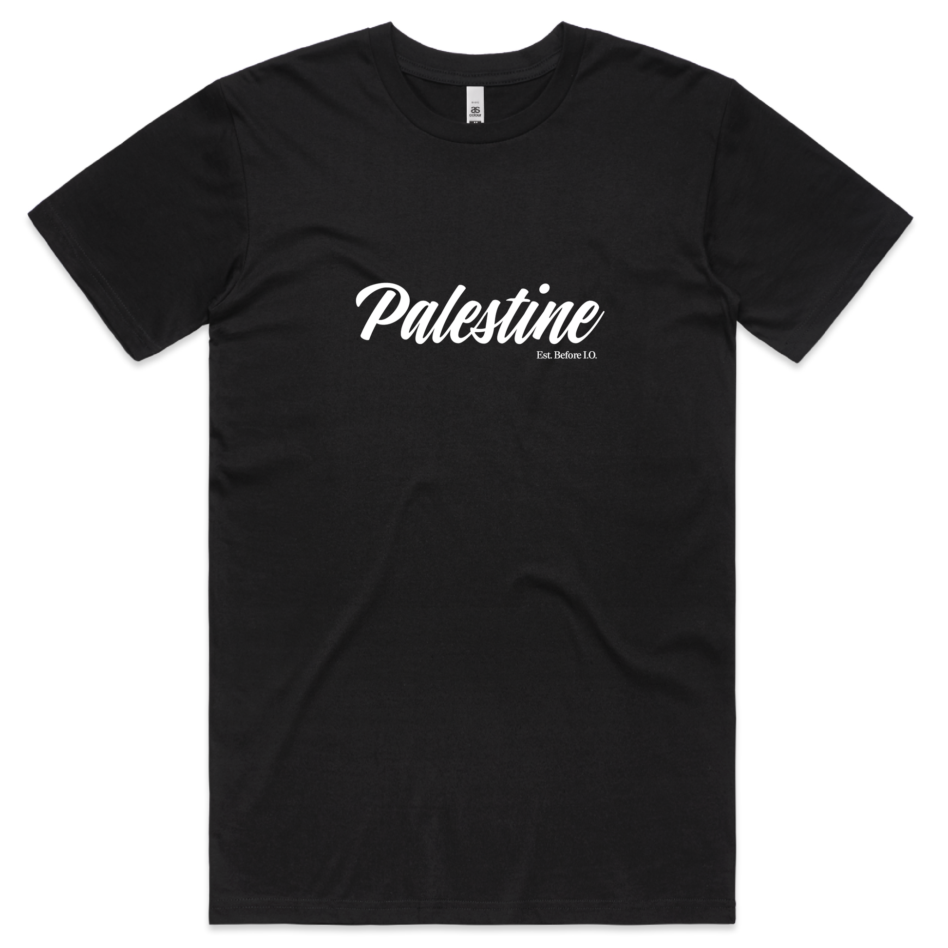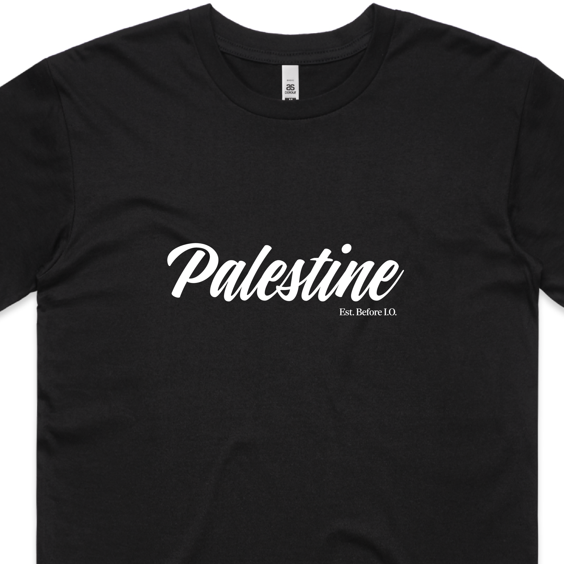 Palestine written in a bold cursive font, established before Israeli occupation (Est. Before I.O.).