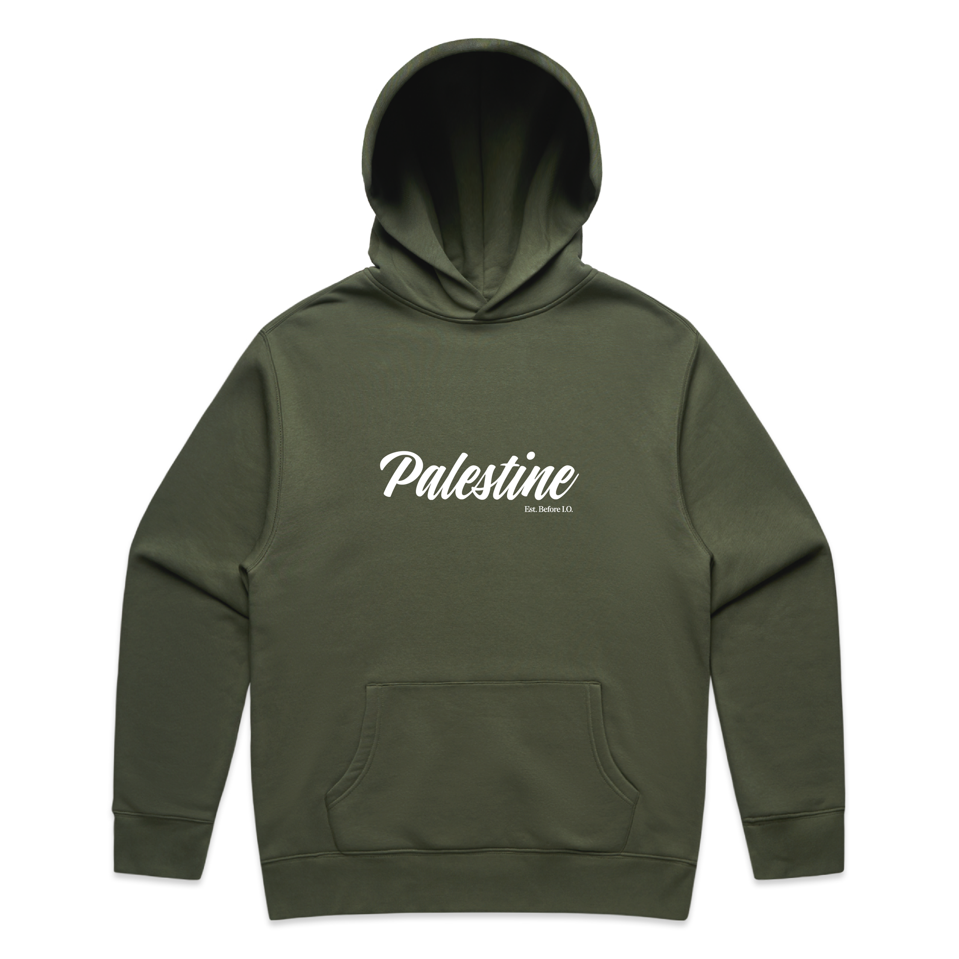 Palestine written in a bold cursive font, established before Israeli occupation (Est. Before I.O.).