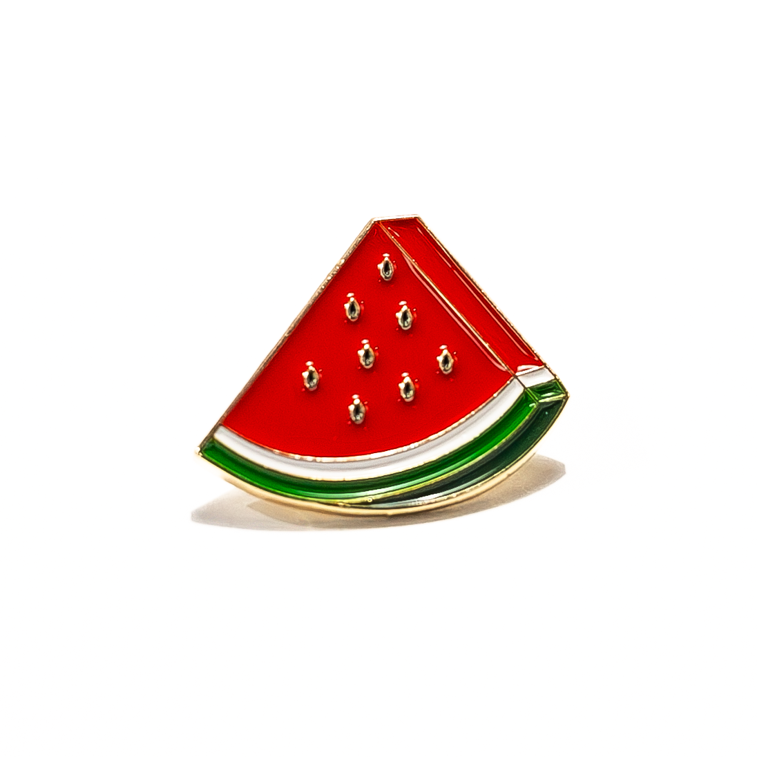 A subtle way to show your support. This new watermelon enamel pin features all the colours of the Palestinian flag. Perfect for jackets, bags, hats, or anywhere you want to subtly express solidarity and add meaning to your everyday look.